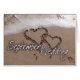 Kort för bröllop för September destinationsstrand - två hjärtor i sanden med det vinkara hav och September bröllop i vitroligtstilsort.