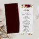 Det här enkla burgundiska menykortet för blommigt är perfekt för ett enkelt bröllop. Den vackra och strålande kantlinjen illustrerar designen med elegant, persika, mörk röd, rosa, vit, vattenfärg, burgundy och pristina blommor som är väl grupperade i en fantastisk bouquet på en bädd av nedåtgående grönt. Den här menyn kan användas för bröllopsmottagning, repetitionsmiddag, möhippa eller vilken händelse som helst.