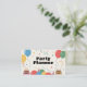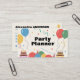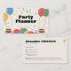 Ett visitkort för festarrangör dekorerat med födelsedagstårtor, färgglada ballonger, födelsemössor, twists och konfetti. Perfekt för inbjudningskort eller för evenemangsarrangörer som födelsedagsfester för barn eller vuxna, produktlanseringar, baby shower, familjefirande, bröllopsjubileum, möhippa, temafest osv. Baksidan av kortet har fullständig kontaktinformation och en lista över tjänster.