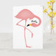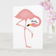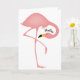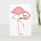 Ett hälsningkort som presenterar en illustration av en flamingo med den buktade nacken, besegrar. Personifiera hälsningen ovanför flamingo'sens huvud.