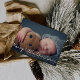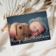 Den vita skriptdesignen med ett underbart nyfött foto från baby, bilden och textdetaljen för detta kort kan vara personlig.