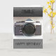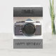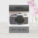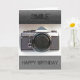 Ett svartvitt fotograferar av en vintagekamera mot en grå färgbakgrund