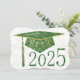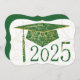 Utformning av blommigt på studentmössa, bakgrund och år. Grönt på vit bakgrund. Baksidan har en grönt med guld-tecken för tillkännagivande för studenten.