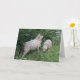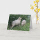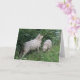 Det här söta hälsningskortet innehåller ett foto av ett par söta fluffa får. Fårarna omges av vild blommor och långgräs och står under ett träd och når upp och äter högljutt lite löv. De har tjockvita jackar av ull och mycket sött ansikte.