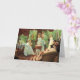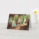 Kort för hälsning för party för James Tissot VictorianTea. Oljemålning på kanfas från 1878. För James Tissots för fransk konstnär feautures för party för Tea Victorian (i drivhuset) per gruppen av Victorianaristokrater som tar tea i ett drivhusväxthus. Vardagsrumar för en kvinna i en stol i ett rött och rosor klär, systersmutten för stunder två från tekoppar som ha på sig matcha lätt - blåttVictorianklänningar med strumpebandsorden och brådska. En ung man sitter närliggande, som en koppla ihop i bakgrunden pratar. Palmträdet kan ses till och med drivhusexponeringsglaset. En härlig gåva för fläktar av James Tissot, Victorian England, vintageteapartyn och Victorianmode.