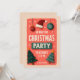 Att charma julkortet party med julhatt, prydnadsföremål, candy cane och dekorerat träd mot en varm röd bakgrund, perfekt för ett glatt firande.