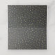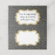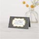 Grått-uppfällt platskort med guld-ton-polka-punktbakgrund. Bilder av en textplaque med kanter i guld på framsidan är redo att anpassa sig för hand för varje gäst vid bröllop. Kortets baksida har samma guld-kantade plakett med anpassningsbarnas svarta redo för att du ska kunna byta till att läsa vad du vill.