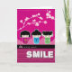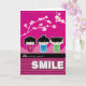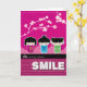 Gullig och colorfullhälsning som dekoreras med kokeshien (japanska dockor), rosa bakgrund och körsbärblommor