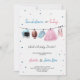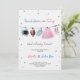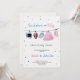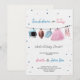 Framsidan av en inbjudan för könsbestämning med en fotboll, tutu och balettskor på en tvättlina. Texten lyder "Touchdown eller Tutus?" i pastellfärger.