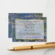 Ett lysande invigningskort, med Monets bra konsmålning av Vatten Lilies som bakgrund. Bilder av ett vitt genomskinligt textområde med kanter i guld på framsidan. Svart och blå text är redo att anpassa för bröllop.