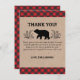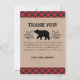 Personifiera denna stilfulla lumberjack, tema sombaby shower tackar dig att card för dina gäster. Denna design presenterar en gullig bebisbjörn med någon skogsmarklövverk och en buffelplädgräns. Baksidaen av kortet är också buffelplädet. Det finns en koordinerande baby showerinbjudan också som är tillgänglig på lagret.