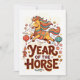 Kort med en livfull illustrerad häst omgiven av traditionella dekorationselement för att fira månnyåret Häst. Lämpligt för nyårshälsningar, kulturella firanden och presentidéer med anknytning till zodiaken, med en modern illustrationsstil som är både respektfull och tilltalande.