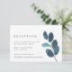 Designat att samordna med vår pressade botaniska insamling i bröllop, har det här chicen med ultramarinblått och vitt mottagningskort en enda vår av pulant mörk teal vattenfärgsbotaniskt löv, vid sidan av dina mottagningsuppgifter, inklusive tidpunkt, plats och adress.