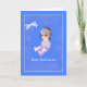 Det här söt-kortet är medelblått, ett litet baby i lila, som bär en lila på mörkens hår. Det finns en polkapunkt gräns med en vit bog runt baby och en tunn vit gräns. Tack vare Elena's design för baby-teckningen.