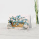 Kort för vintagepåskägghälsning, vitägg i en påskbasket med lilla blommor för blått