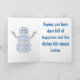 Fyra kvadrerar i blek deppighet, och lila dekoreras med snögubbear som ha på sig top hat och, övervintrar att bekläda, lika kälkar, scarves och mittens. Att sy för vit tillfogar ett dekorativt handlag som ger det upprepande mönster det utseendemässigt av ett täcke och att skapa en perfekt mysigt känsla för vinter. Forma av en snögubbe skapar en maskera för att designen ska tillfoga ett säsongsbetonat handlag för final till insidan och baksidaen av kortet. Texten på insidan av kortet kan ändras för att skapa en unik hälsning av ditt eget.