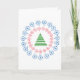 En stiliserad grön gran sitter i mitten av en cirkel av små röda prydnader, innanför en cirkel av medelstora blå prydnader. På insidan kan du anpassa texten som lyder "God Jul - Önskar er lycka till det nya året!" I det övre högra hörnet finns ytterligare tre dekorativa kulor i blått, grönt och rött. Längst ner till vänster finns den stiliserade granen i grönt.