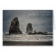 Nål, taggiga bergsspirer, i Cannon Beach i Oregon, på en grumlig och stormig dag.