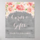 Kort och present skylt affisch för baby shower, bröllop eller brud shower i ljusgrått landligt rustikt trä mönster med ljus rosafärgad vintage akvarell blommor. Perfekt för en baby shower, bröllop eller brud shower.