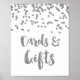 Kort och presenter bröllop eller baby shower skylt affisch i vit och silver konfetti mönster med handskriven stilisering.