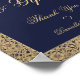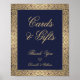 En vintage design för ett elegant bröllopsskylt med marinblå och guld som bröllopsfärger. Bakgrunden är marinblå. Den har blomsterguldbårder med invecklad vildrosdekor. All text - "Cards & Gifts", "Tack" och namnen - är skriven med en elegant kalligrafisk stil. Ovanför namnen finns ett litet guldlite hjärta.