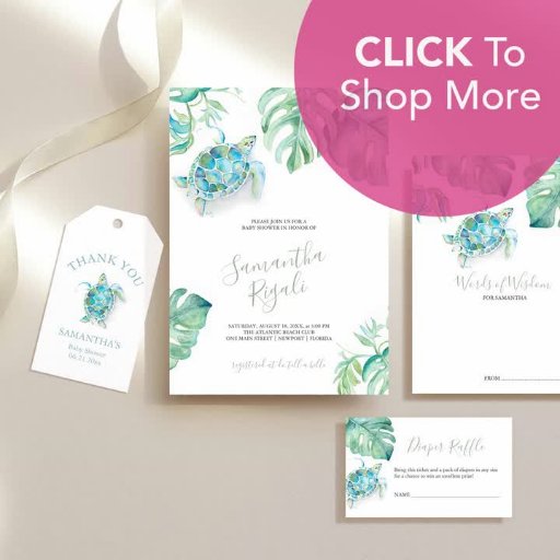 Ett designat raffelkort för tropisk havssköldpadda, med originalfärgad grafik av Victoria Grigaliunas. Om du vill se hela babyduschtemat och spelen går du till www.zazzle.com/dotellabelle