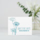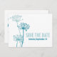 Vackra, enkla akvafblåa körvel eller korvar - blommor sparar bröllop-vykortet. Det här sparar datumet för bröllopsinbjudan med en modern blomma teckning i stil på kor parsley eller Anthriscus sylvestris, även känd som vild chervil, vild har blivit parsley, kreck eller drottning Anne's snöre. Redigera inbjudan med din egen ord, bröllop och namn. En exklusiv för elegant som utarbetats av Sarah Trett.