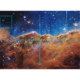I hjärtat av Carinanebulosan, 7 600 ljusår bort, ligger en scen av hisnande kosmisk våldsamhet. Här reser sig kanten på ett jättelikt gasfyllt hålrum som en odjursliknande vägg, vars yta formats till ett fantasifullt landskap av toppar och dalar. Dessa är de träffande benämnda "kosmiska klipporna", inte klippor av sten som vi känner dem, utan kolossala strukturer av gas och stoft som ständigt bombarderas av unga, osynliga stjärnors raseri. Intensiv ultraviolett strålning och stjärnvindar spränger mot de höga formationerna och eroderar dem långsamt som en skulptör som arbetar med kosmisk lera. Men mitt i förstörelsen slår skapelsen tillbaka. Nya stjärnor tänds i de formade pelarna och tentakliknande strukturerna, och deras flammande födelseplatser markeras av en livfull mosaik av färger. De en gång ogenomträngliga stoftmolnen genomborras av James Webb-teleskopets skarpa infraröda öga, och avslöjar en dynamisk dans mellan stjärnvindarnas rå