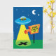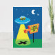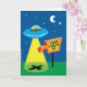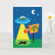 Födelsedagskort med två gröntars utomjordingar i en flygande såare som ger dig en kostnadsfri kontroll för din födelsedag. Gå bara in i ljuset, som det står på skylten.