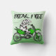 En tecknad, illustration av en svart och vit ko som flyr från en gård på en grönt motorcykel.