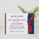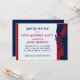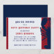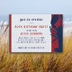 Röd, vit och blå födelsedagsinbjudan med kräfta-design. Maskulina tryckta teckensnitt med grunge-typografi och röd och blå text. Bakgrunden är mycket ljusgrå, med röd grafik bakom kräftan på kanten av de horisontella korten. Baksidan är enfärgat blå.