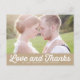 Ge dina tackkort en rolig, nostalgisk touch med detta anpassade horisontella fotobrut tackkort för bröllop. Designat med fet, retroinspirerad "kärlek och tack"-typografi över ditt favoritbröllopsfoto, kombinerar detta kort vintage-karaktär med modern personlig anpassning.