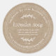 Kraft White Rustic Lavender Soap-etiketten har en varm kraftpappersbakgrund med mjuk vit text, accentuerad med sömsöm och enkla botaniska detaljer för en hantverksmässig, handgjord känsla. Perfekt för småpartier lavendeltvål, produkter till bondens marknad och förpackningar för naturlig kroppsvård, har denna runda etikett utrymme för ingredienser, vikt och ditt företagsnamn eller webbplats. Dess rustika charm och rena layout ger varje tvålstång en polerad, hantverkad touch.