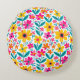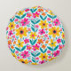 En rund kudde prydd med kraftfulla, färgglada blommor i varma gula, rosa, röda och teal färger som tillför glatt, modern charm till soffgrupper, sängar och mysiga läshörnor. En stilren och presentfärdig accent för älskare av ljusa blommor och uppiggande heminredning.