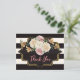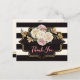 Det här eleganta tackkortet för bröllopsfest matchar samlingen med inbjudningskort till bröllopsfest som visas nedan och har ett brett horisontellt randigt mönster i svart och elfenben med en dekorativ svart textruta i hakparentesform med två yttre guldkanter. Det finns en stor färgrik blomsterbukett längst upp i mitten av kortet med vackra rosor i kräm, elfenben och rosa, med orange peruanska liljor och grön lövverk. Baksidan av kortet är elfenben och har en liten nedre kant i svart med en remsa simulerat guld tvärs över kortets bredd. En annan liten blomsterbukett finns i det nedre högra hörnet. Kortet är tomt så att du kan skriva ett tackmeddelande för hand, men du kan också lägga till ett förtryckt tackmeddel