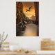 Triceratops ligger nära floden, Velociraptorn korsar en stenbro och Pterodactyl flyger över när sol går ner. Dinosauurerna slåss inte, bara hänger i samma ravin vid solnedgången. .Den här poster av tre populära dinosaurier från den vedertagna perioden finns i många storlekar och priser samt i en digital nedladdning.
