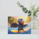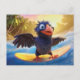 En stilisert tecknad kråka åker på ett gult surfbräda över havsvågor i en tropisk strandmiljö. Med palmer, solsken och lekfull rörelse utstrålar scenen sommarfrihet och lättsamt äventyr i en fantasifull övärld.