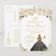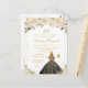 Denna eleganta och glamourösa födelsedagsfestinbjudan har en vacker prinsessa med blondt hår och ljus hy i en svart klänning. Texten kombinerar handskriven skrift och moderna sans serif-teckensnitt för en klassisk och sofistikerad look. De blomsterarrangemang, fjärilar och gyllene konfetti skapar den perfekta blandningen av rustik och chic.