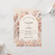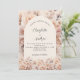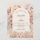 En modern, stilren och romantisk bröllopsinbjudan. Krämig, persikofärgad bakgrund, valvformad ram, dekorerad med krämfärgade blommor. Anpassa och lägg till era namn och detaljer.