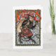 Julkort med Krampus som bär en säck med stygga barn, en kedja och en piskstock.