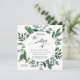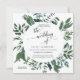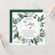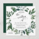 Square formaterar inbjudan. Enkelt. Modernt. Elegant. Ideal för ett bröllop i varje säsong, detta skogen samlade lövverkvattenfärgkonstverk skapades av konstnären, Audrey Jeanne Roberts. Presentera: eucalyptuslöv, kärnad ur eucalyptus, ferns och löv i den rika smaragden, skoggrönt. Ta copyrightt på.