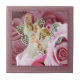 Två änglar som förställas som fjärilar, har rolig danande en kran av blommor ut ur några rosa ros.