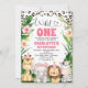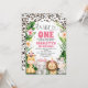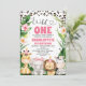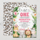 Söt safari-tematisk inbjudan till första födelsedagen med en krans av löv och blommor, roseguld glitter gepardtryck och fyra söta safari-djur. Denna vilda safari-födelsedagsinbjudan är perfekt för alla som gillar gepardtryck.