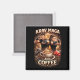 Two determined fighters pose in striking stances beside a steaming cup of coffee, blending martial arts intensity with everyday humor.