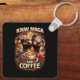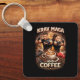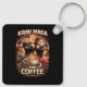Två beslutsamma fighters poserar i slående ställningar bredvid en ångande kopp kaffe och blandar kampsportintensitet med vardaglig humor.