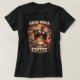 Två beslutsamma fighters poserar i slående ställningar bredvid en ångande kopp kaffe och blandar kampsportintensitet med vardaglig humor.