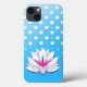 Konstnärlig arrangemang av en rosa tusensköna med delikat spetsarbete på en livfull blå bakgrund med vita prickar, som förmedlar konstnärligt uttryck och elegans.