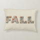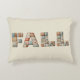 En mysigt dekorativ kudde med ord "FALL" som är skriven i faux quilted lapptäcke brev. Varje brev är tillverkat av olika typer av mönster i varma hösttoner som orange, brun, teal och grädde, vilket skapar ett rustikjordbruk och säsong.