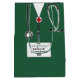 Unik sjuksköterskepåse med grönt sjukhusskrubar, stetoskop och en stor gratulerar. Redigera text för att lägga till sjuksköterskans namn.