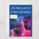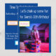 Bild av en flicka på toppen av en kritad brevlåda på en blå bakgrund med festdetaljer på baksidan.